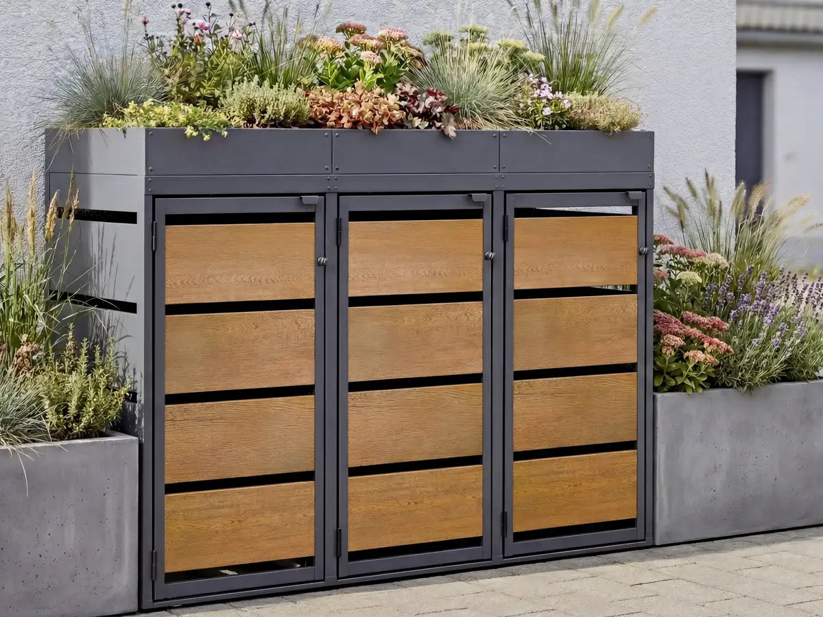 Die Mülltonnenbox mit Pflanzdach verbindet hochwertige Verarbeitung und robuste Materialien mit durchdachter Technik und ist für den dauerhaften Einsatz im Außenbereich konzipiert. Hergestellt aus verzinktem Qualitätsstahl mit robuster Konstruktion sorgt sie für hohe Formstabilität. Die langlebige Beschichtung in Trendfarben mit seidenmattem Glanz und Holzoptik-Fronten bietet hohe Witterungs-, Frost- und UV-Beständigkeit. So entsteht eine Mülltonnenbox, die bei jedem Wetter gut aussieht und über viele Jahre Freude bereitet.