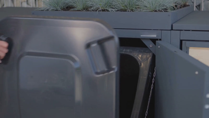 Ausgestattet mit einem Pflanzdach und integrierter Pflanzwanne mit Wasserablauf setzt die Mülltonnenbox ein grünes Highlight, trägt zur Temperaturregulierung bei und verhindert zuverlässig Staunässe. Eine Fangschlaufe (Kette) ermöglicht die einfache Bedienung der Mülltonnen. Das rundum geschlossene Gehäuse mit abschließbaren Türen mit konfortablem Magnetverschluss bietet zusätzlichen Schutz vor unbefugtem Zugriff.