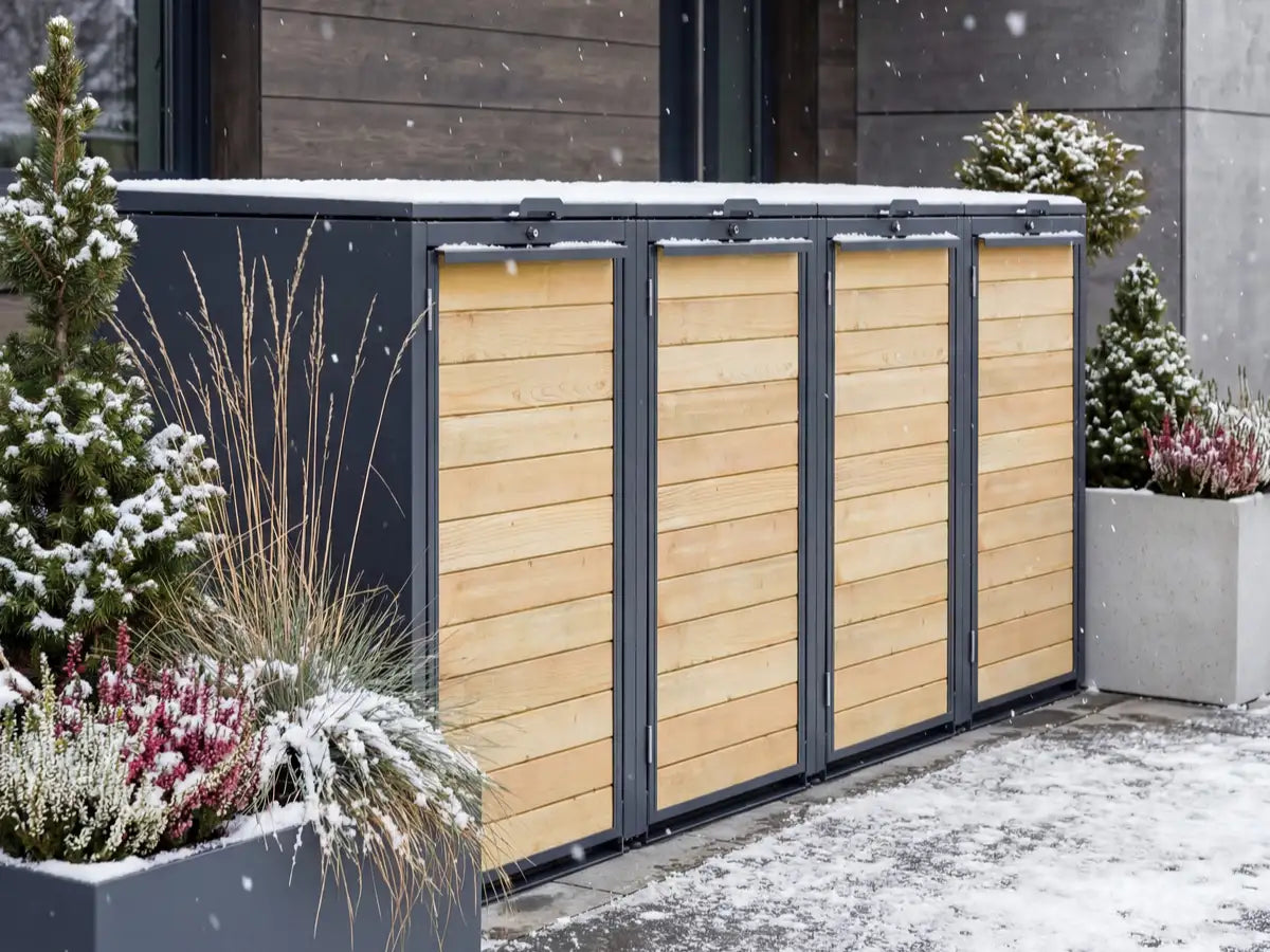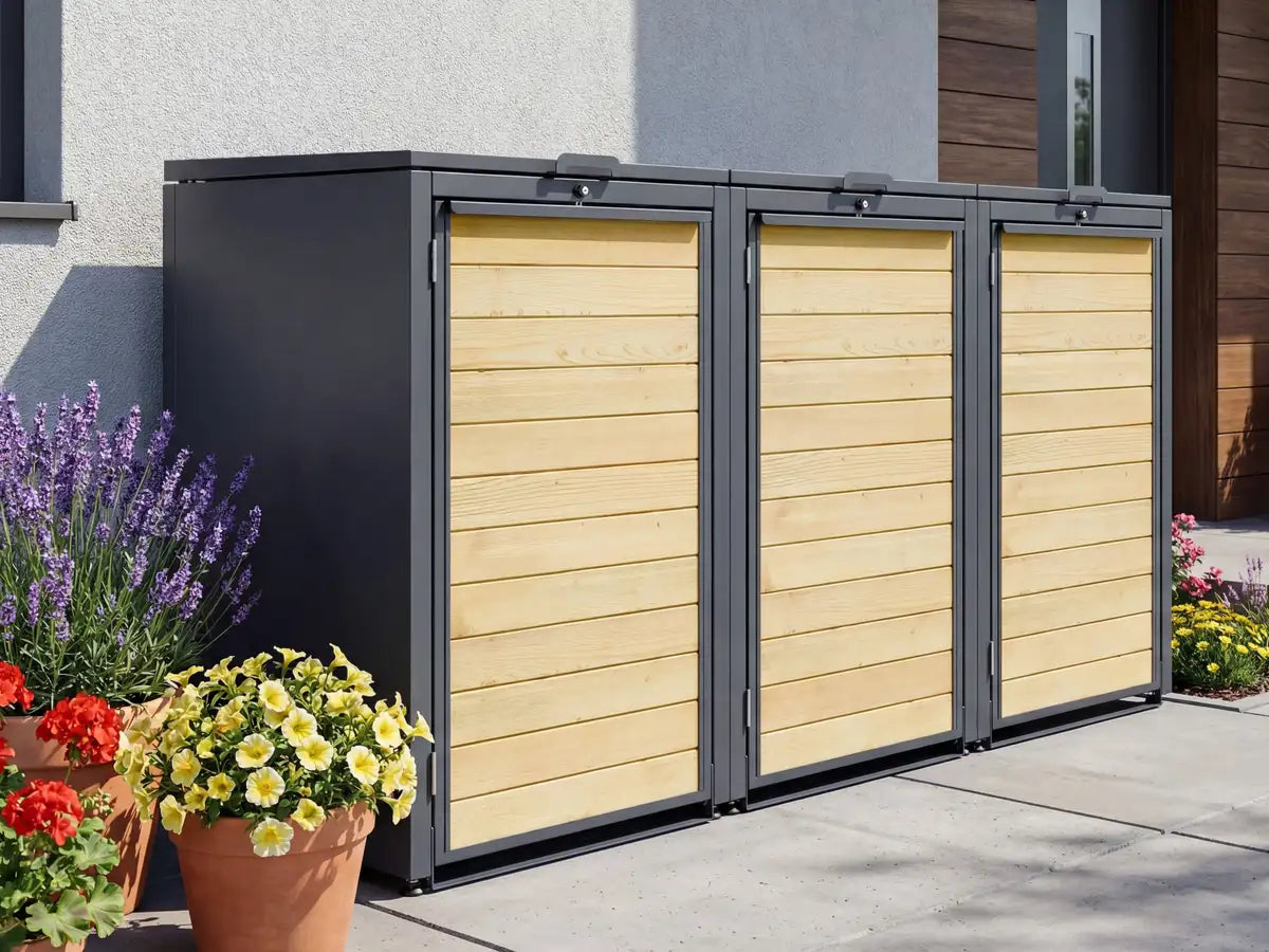 Die Mülltonnenbox als Premiummodell verbindet hochwertige Verarbeitung und ausgewählte Materialien mit innovativer Technik und ist für den dauerhaften Einsatz im Außenbereich konzipiert. Hergestellt aus feuerverzinktem Qualitätsstahl in überdurchschnittlicher Materialstärke und mit robuster Konstruktion sorgt sie für maximale Formstabilität. Die langlebige Beschichtung in Trendfarben mit seidenmattem Glanz und Echtholz-Front bietet hohe Witterungs-, Frost- und UV-Beständigkeit. So entsteht eine Mülltonnenbox, die bei jedem Wetter gut aussieht und über viele Jahre Freude bereitet.