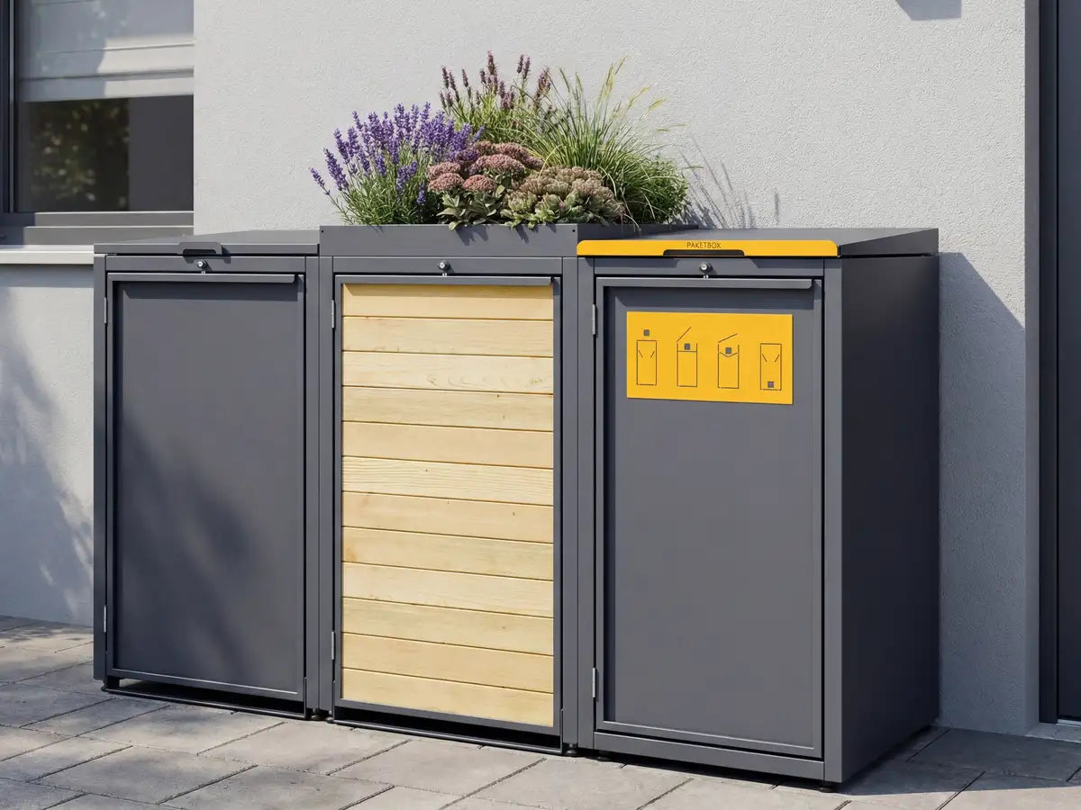• Erhältlich mit 1 - 6 Mülltonnenboxen und Paketbox