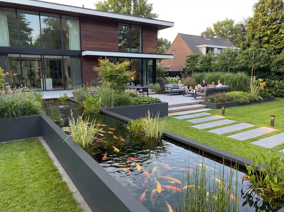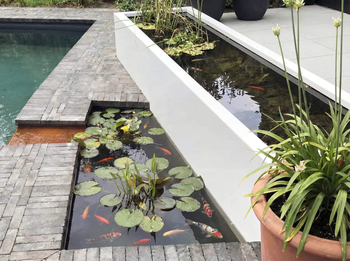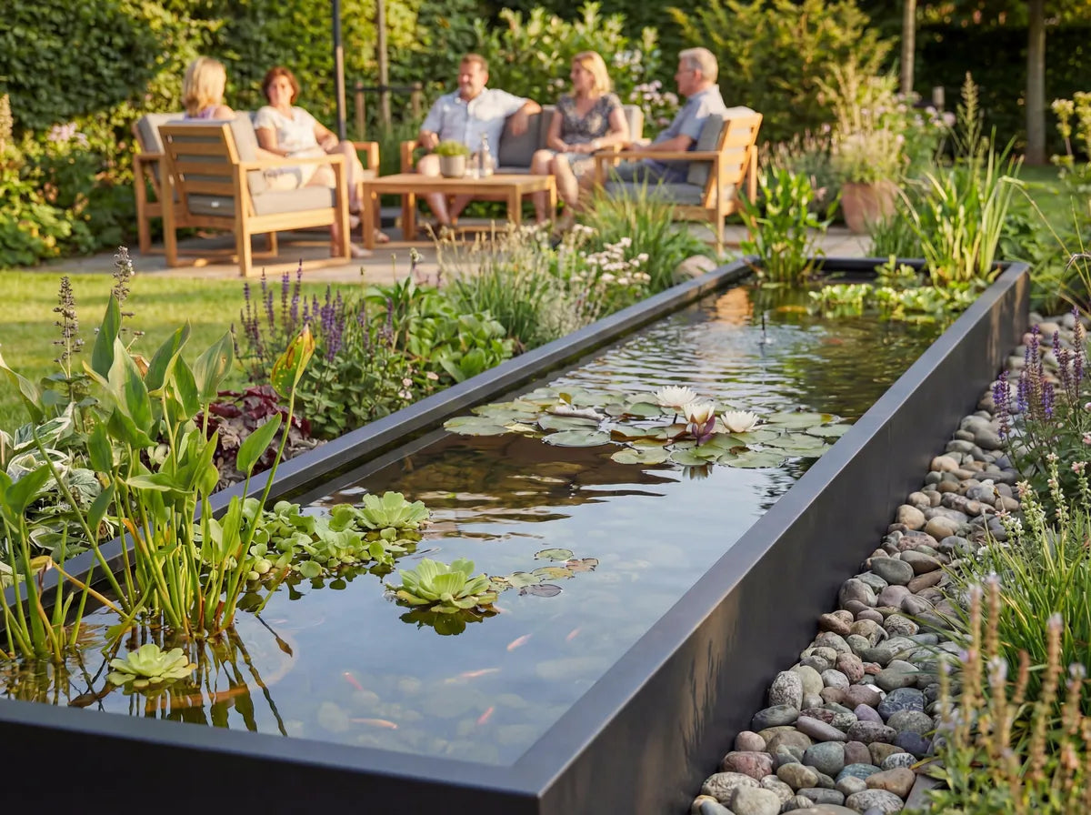 Das moduform® Wasserbecken aus Aluminium ist ideal geeignet, um ein Teichbecken mit einem stabilen, lebendigen Ökosystem für Pflanzen und Fische zu schaffen. Wasserpflanzen und Fische ergänzen sich dabei zu einem natürlichen Gleichgewicht, verbessern die Wasserqualität und bringen spürbar mehr Leben in den Garten. Für einen dauerhaft sauberen Betrieb sorgt die zusätzliche Polyurea-Innenbeschichtung, die Ablösungen im Wasserkreislauf zuverlässig verhindert.