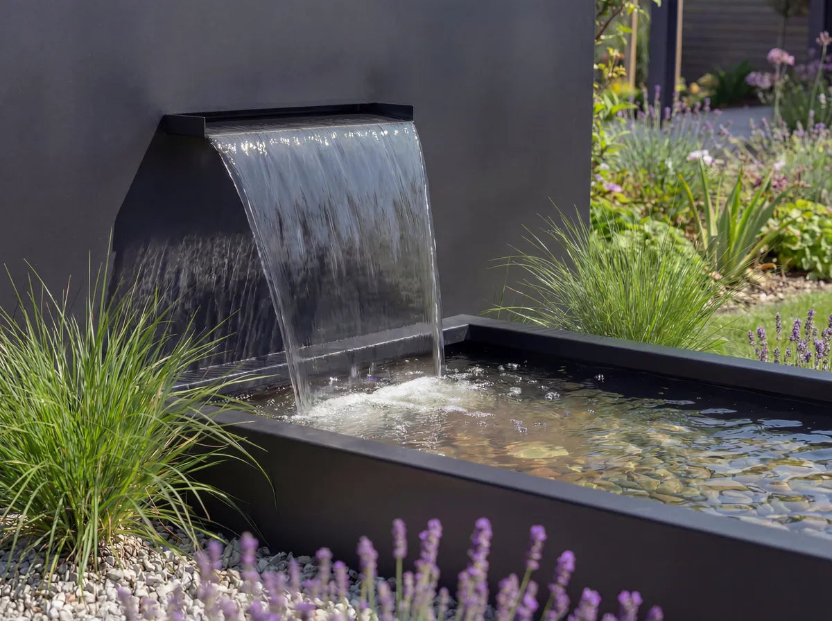 Egal ob als klassischer Gartenteich aus Metall oder als Gartenbrunnen mit faszinierendem Wasserspiel, das moduform® Wasserbecken aus Aluminium bietet vielseitige Gestaltungsmöglichkeiten für den Außenbereich. Es kann mit einer freistehenden oder auf den Beckenrand aufschraubbaren Teichwand mit Wasserfall ausgestattet werden. So bringt ein sanft herabfließender Wasserfall Bewegung ins Wasser und schafft mit seinen angenehmen Wassergeräuschen eine entspannende, natürliche Atmosphäre im Garten.