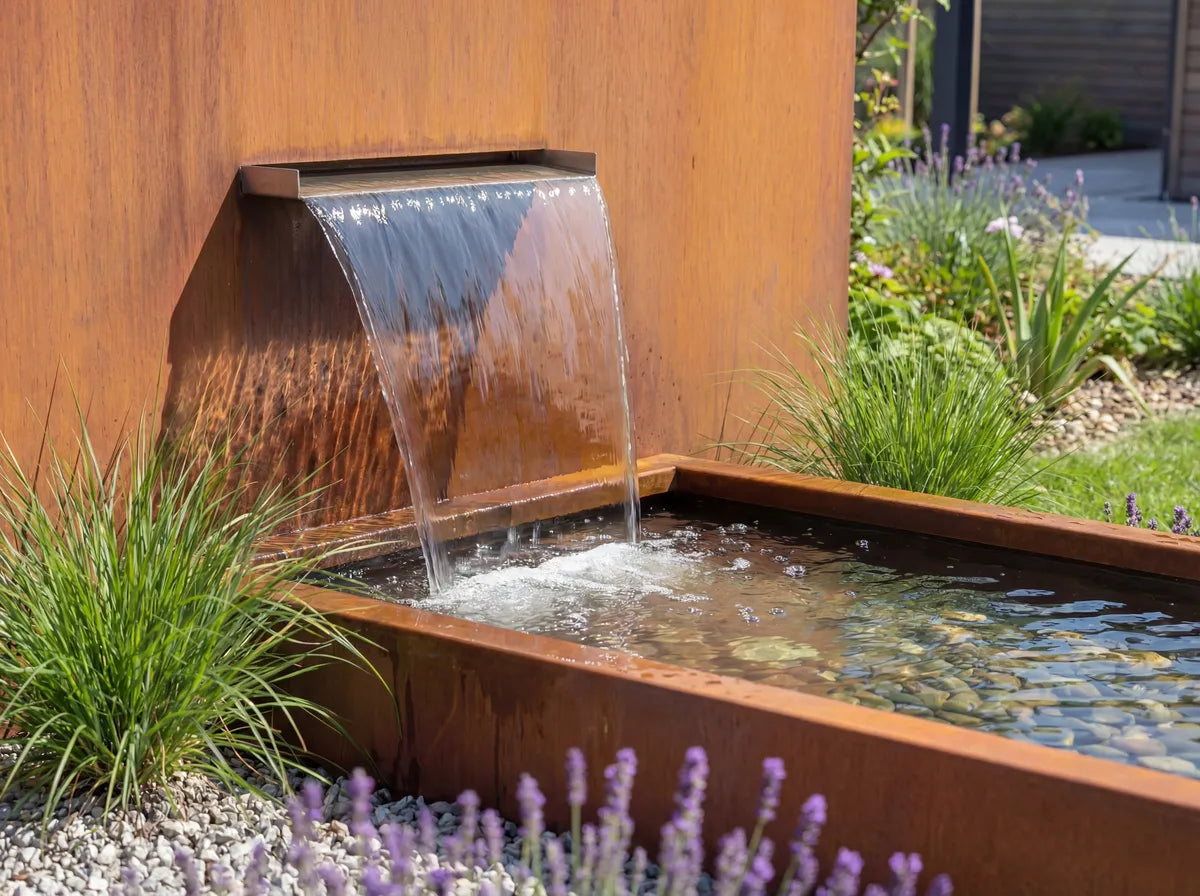 Egal ob als klassischer Gartenteich aus Metall oder als Gartenbrunnen mit faszinierendem Wasserspiel, das moduform® Wasserbecken aus Cortenstahl bietet vielseitige Gestaltungsmöglichkeiten für den Außenbereich. Es kann mit einer freistehenden oder auf den Beckenrand aufschraubbaren Teichwand mit Wasserfall ausgestattet werden. So bringt ein sanft herabfließender Wasserfall Bewegung ins Wasser und schafft mit seinen angenehmen Wassergeräuschen eine entspannende, natürliche Atmosphäre im Garten.