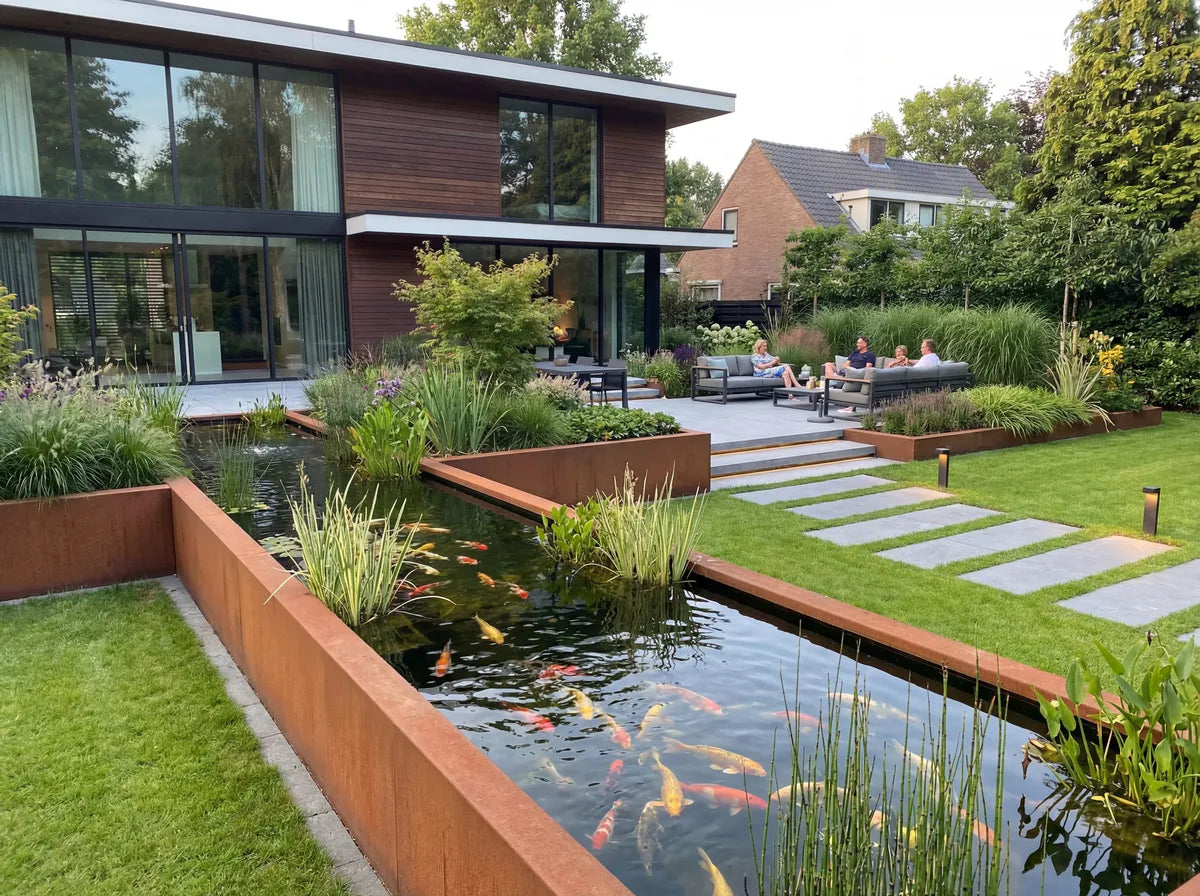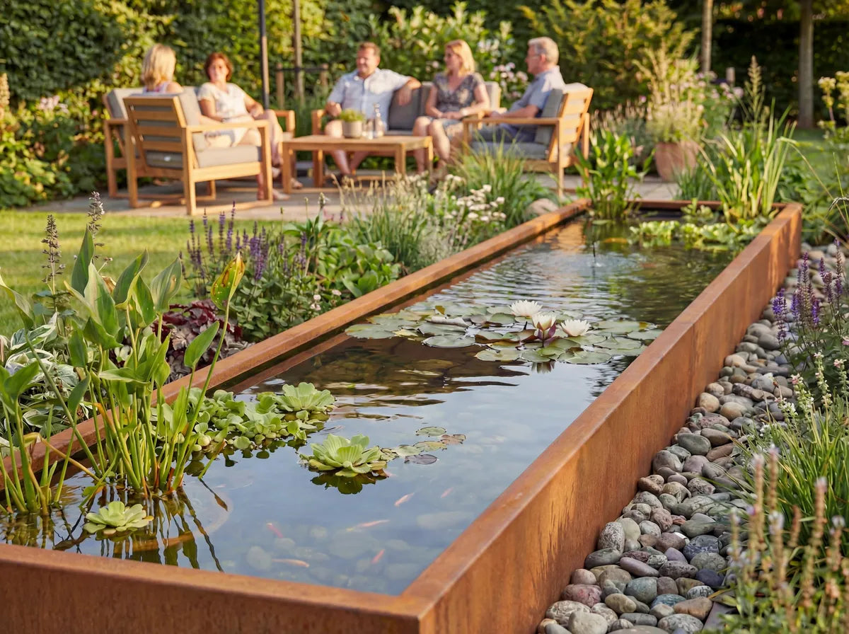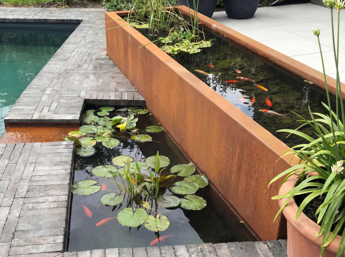 Das moduform® Wasserbecken aus Cortenstahl ist ideal geeignet, um ein Teichbecken mit einem stabilen, lebendigen Ökosystem für Pflanzen und Fische zu schaffen. Wasserpflanzen und Fische ergänzen sich dabei zu einem natürlichen Gleichgewicht, verbessern die Wasserqualität und bringen spürbar mehr Leben in den Garten. Für einen dauerhaft sauberen Betrieb sorgt die zusätzliche Polyurea-Innenbeschichtung, die Rostablösungen im Wasserkreislauf zuverlässig verhindert.